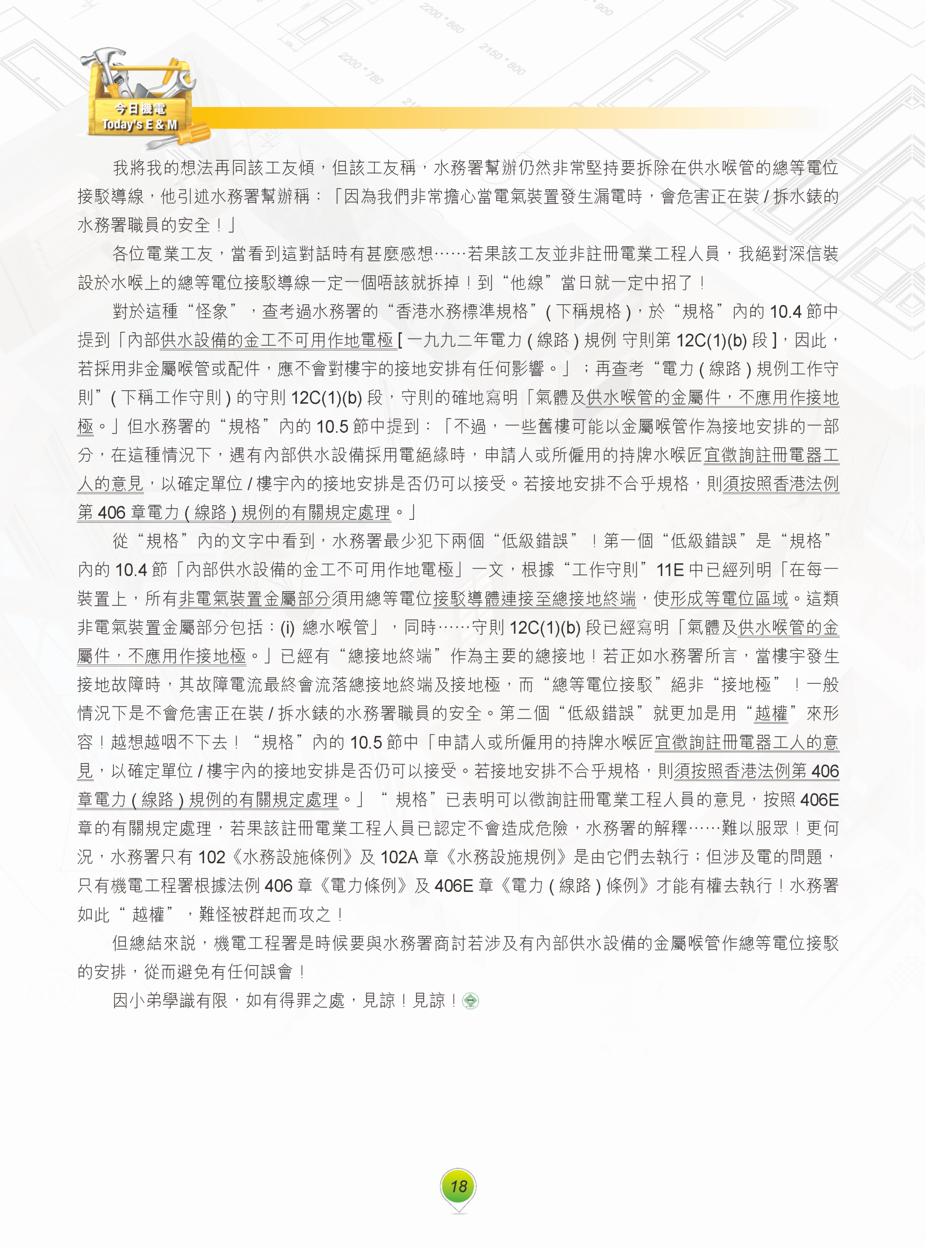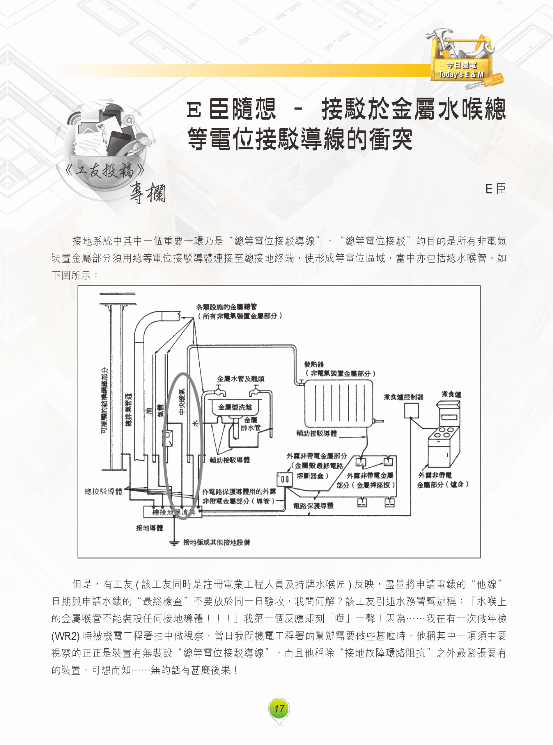 【今日機電第43期】E臣隨想-接駁於金屬水喉總等電位接駁導線的衝突-E 臣