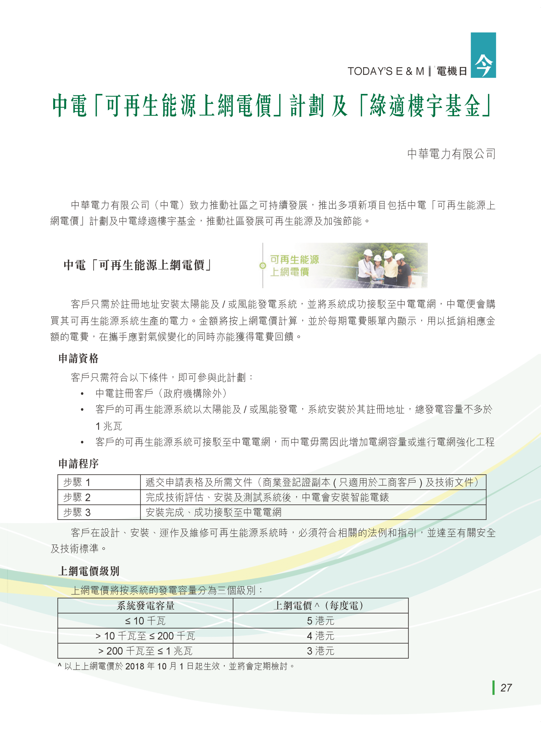 【今日機電第44期】中電「可再生能源上網電價」計劃 及 「綠適樓宇基金」