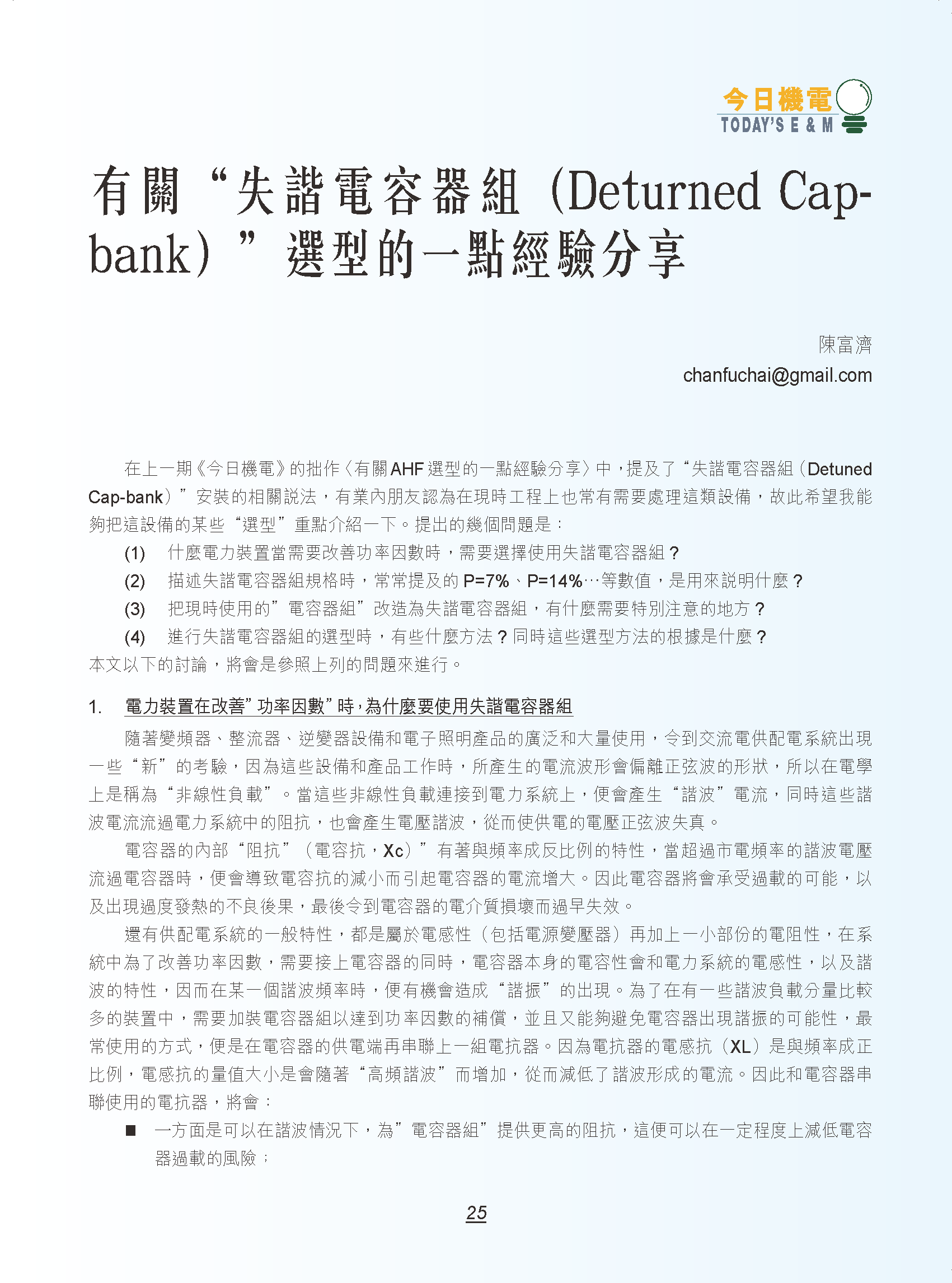 【今日機電第48期】有關“失諧電容器組(Deturned Cap-bank)”選型的一點經驗分享-陳富濟