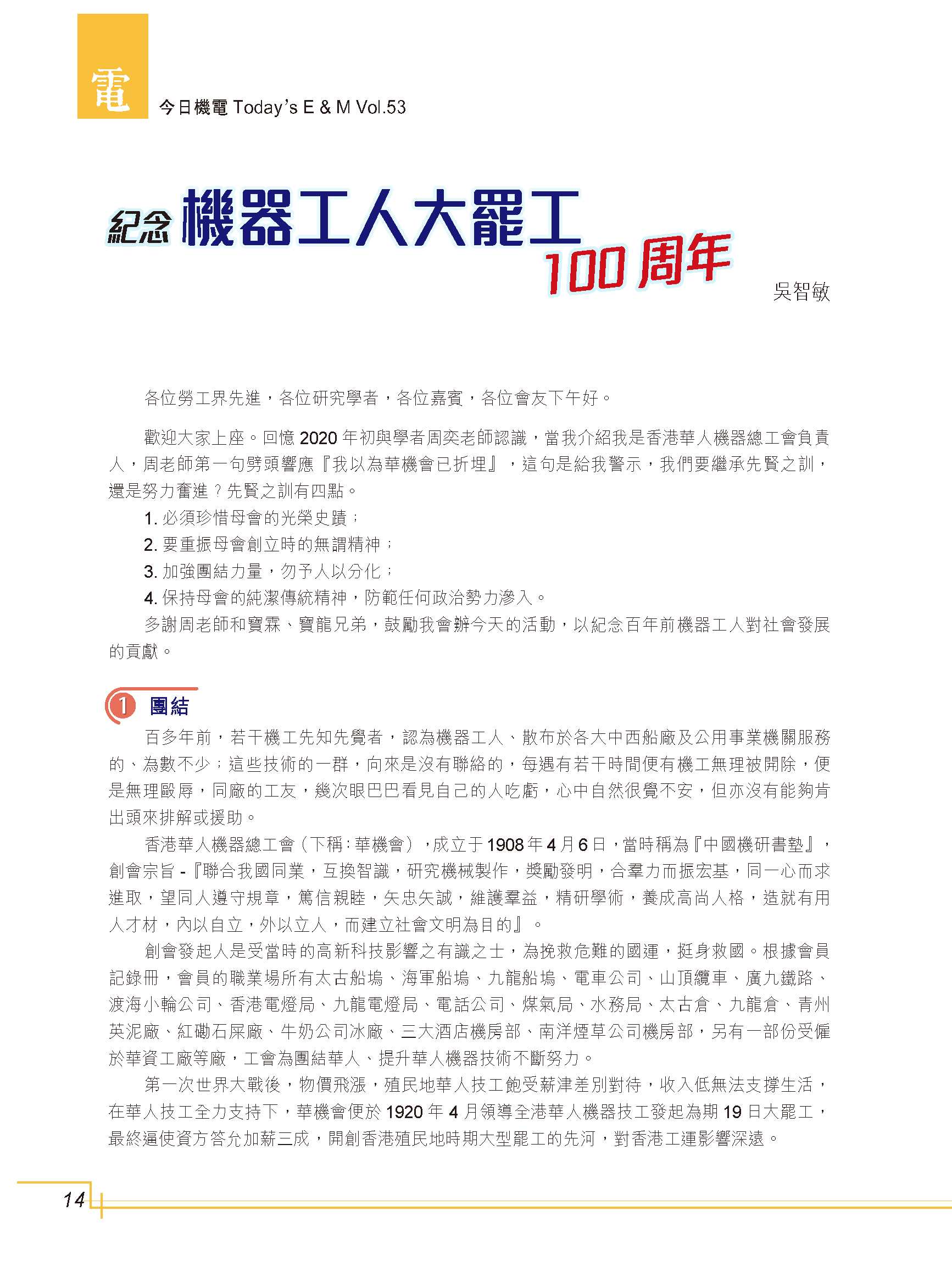 【今日機電第53期】紀念機器工人大罷工一百周年-吳智敏