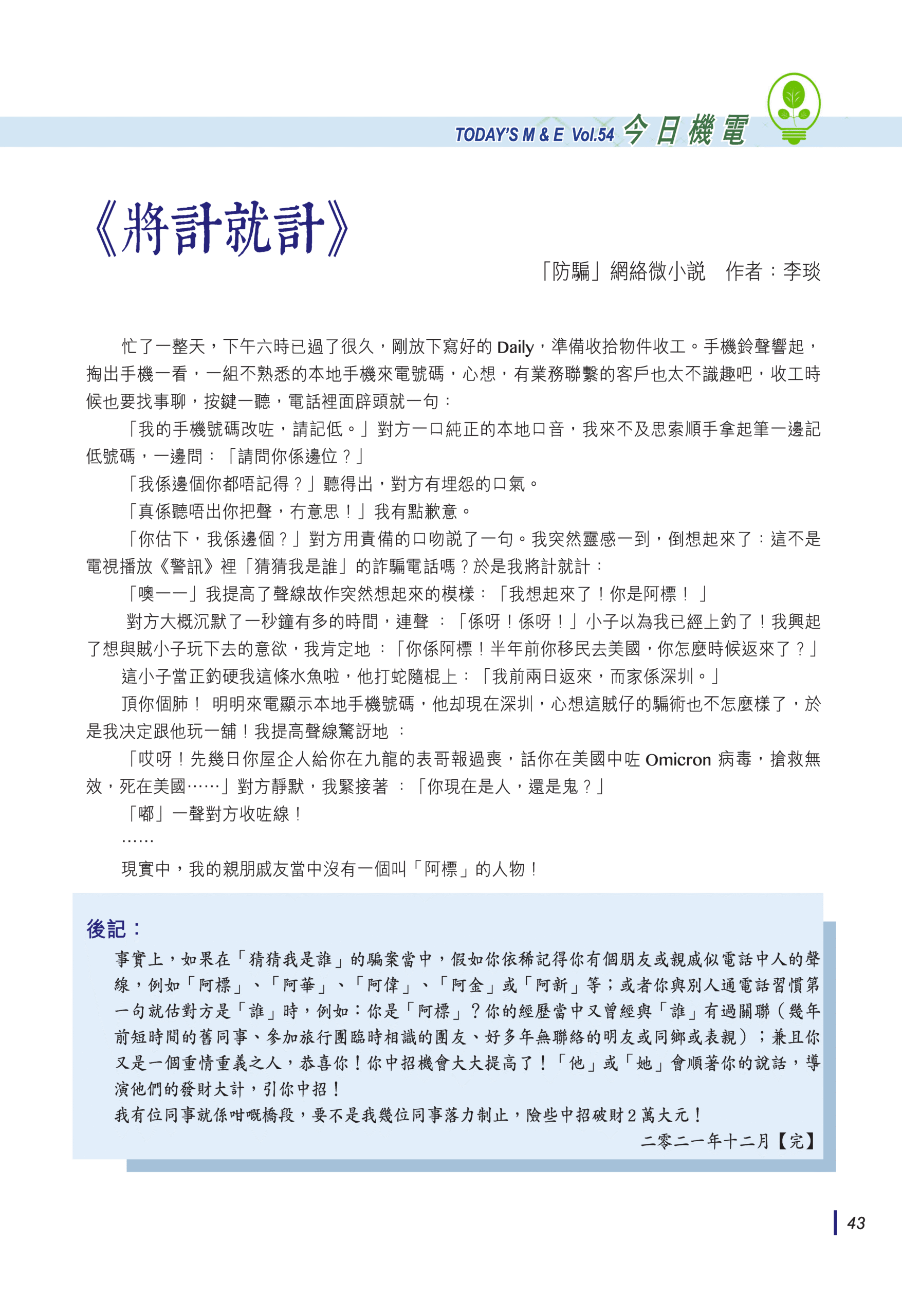 【今日機電第54期】《將計就計》防騙-網絡微小説-李琰