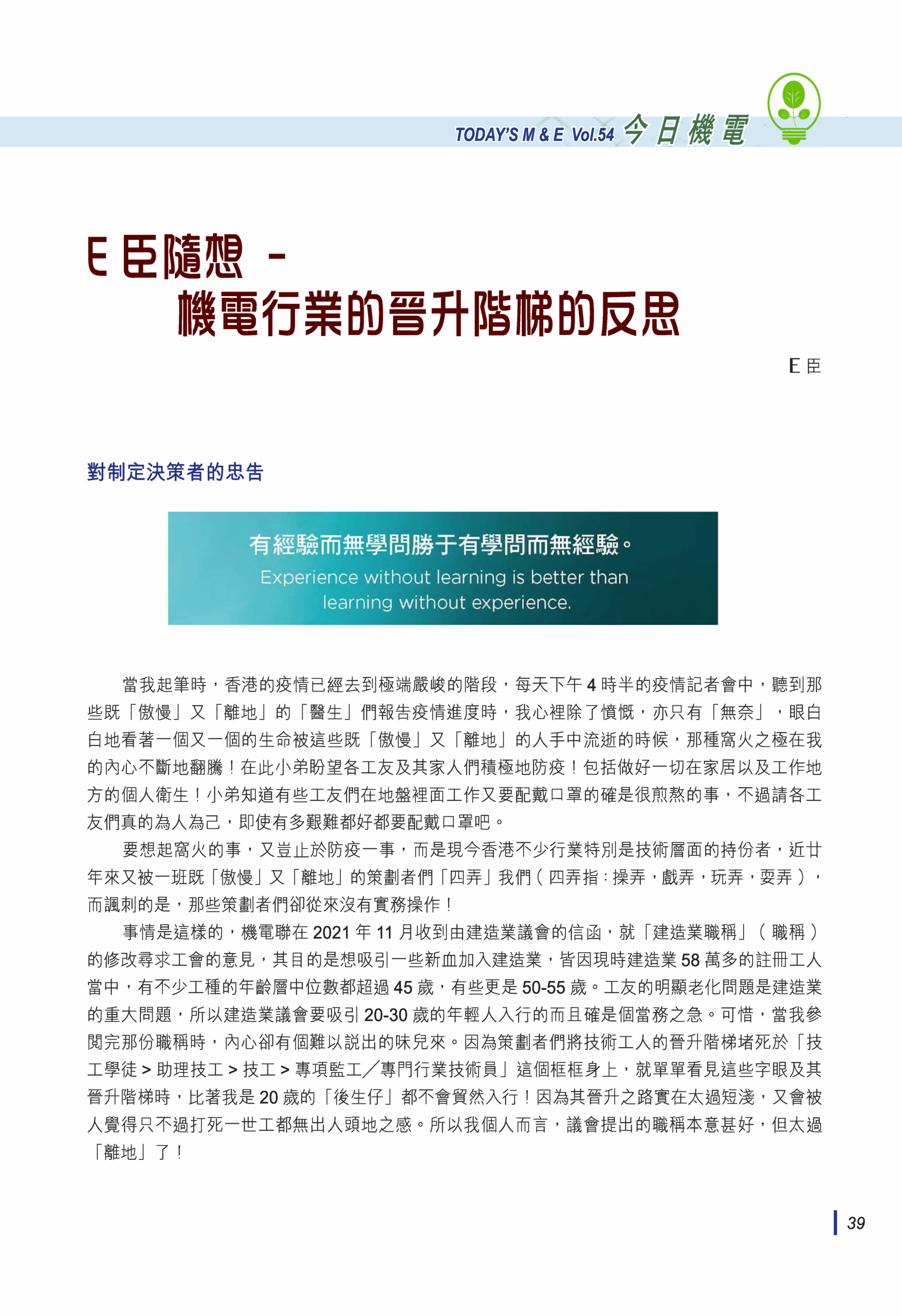 【今日機電第54期】E臣隨想 – 機電行業晉升階梯的反思-E臣