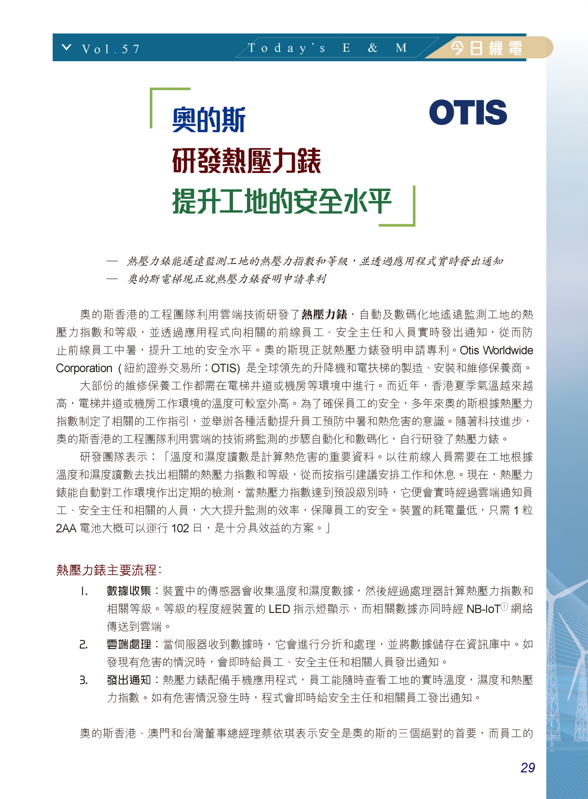 【今日機電第57期】奧的斯研發熱壓力錶提升工地的安全水平