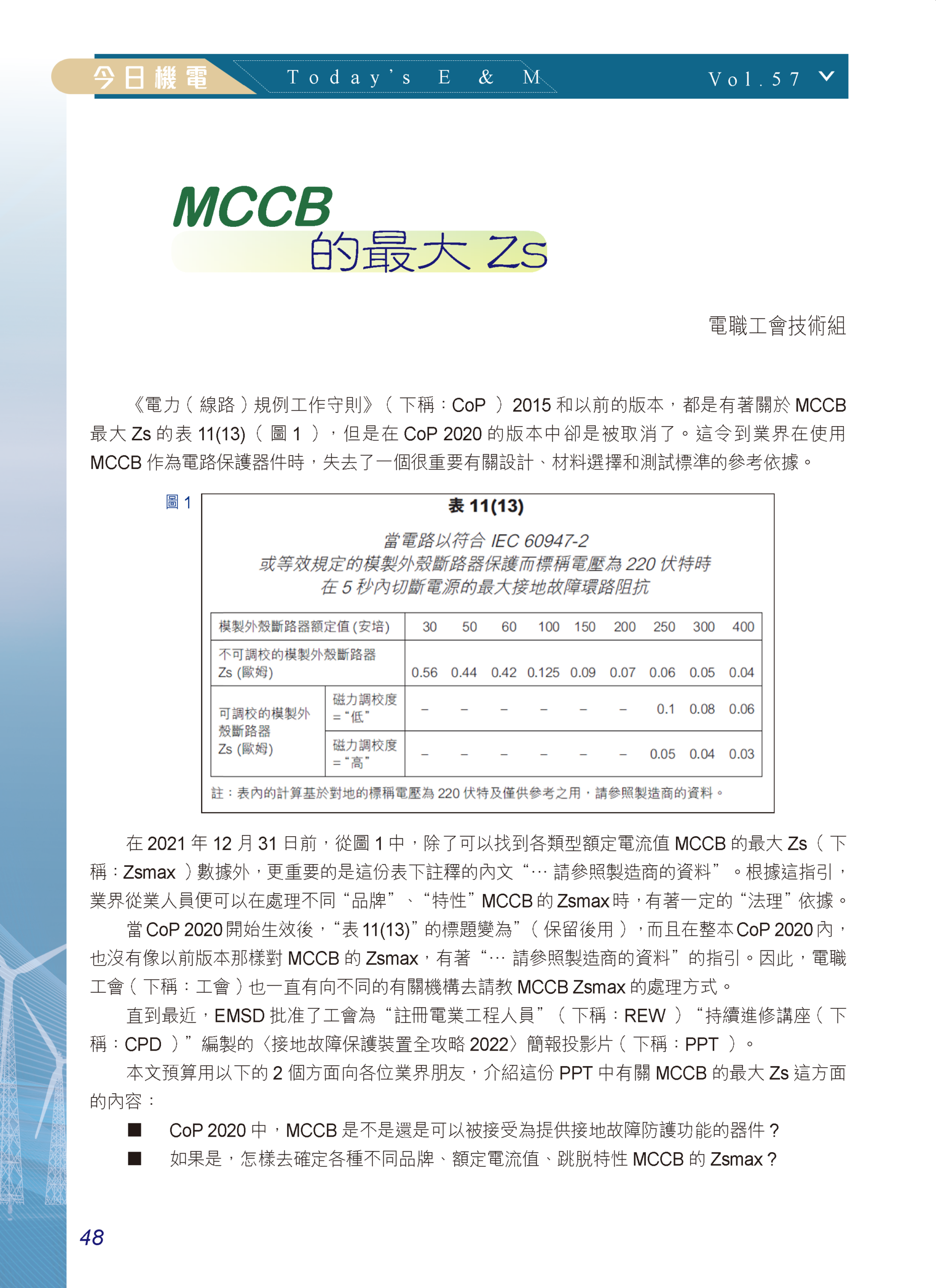 【今日機電第57期】MCCB的最大Zs-電職工會技術組